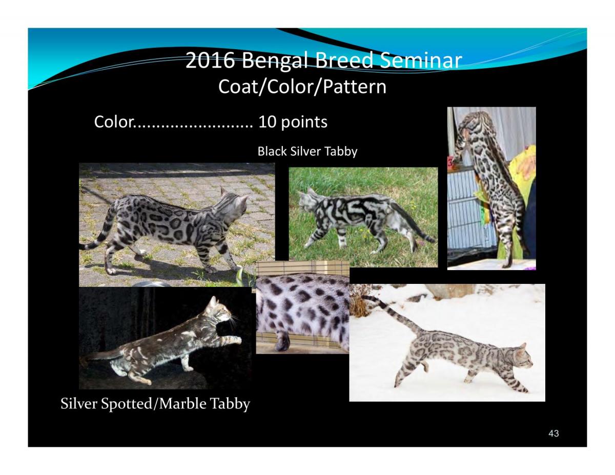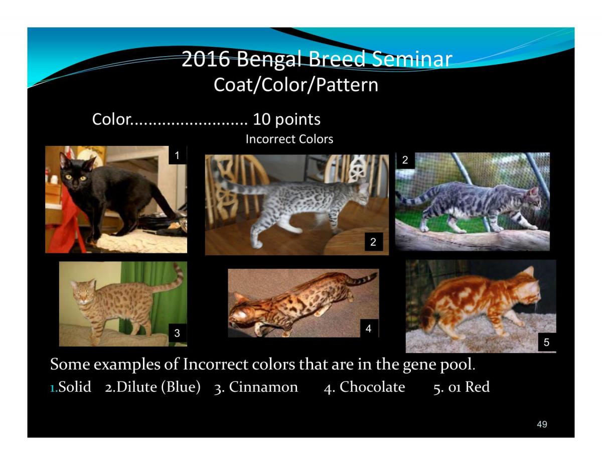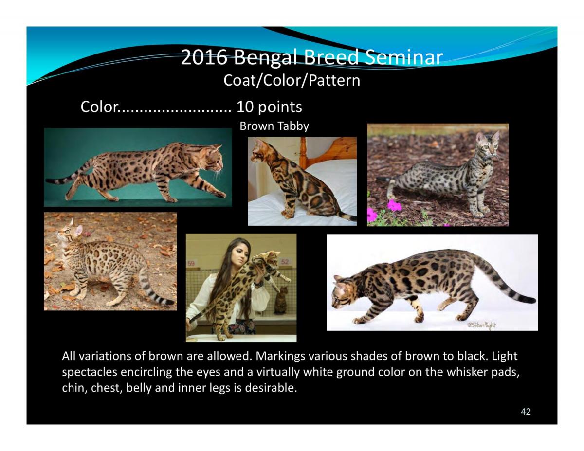 All variations of brown are allowed. Markings various shades of brown to black. Light spectacles encircling the eyes and a virtually white ground color on the whisker pads, chin, chest, belly and inner legs is desirable