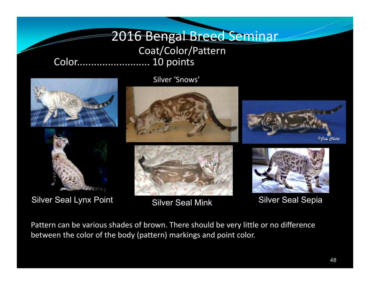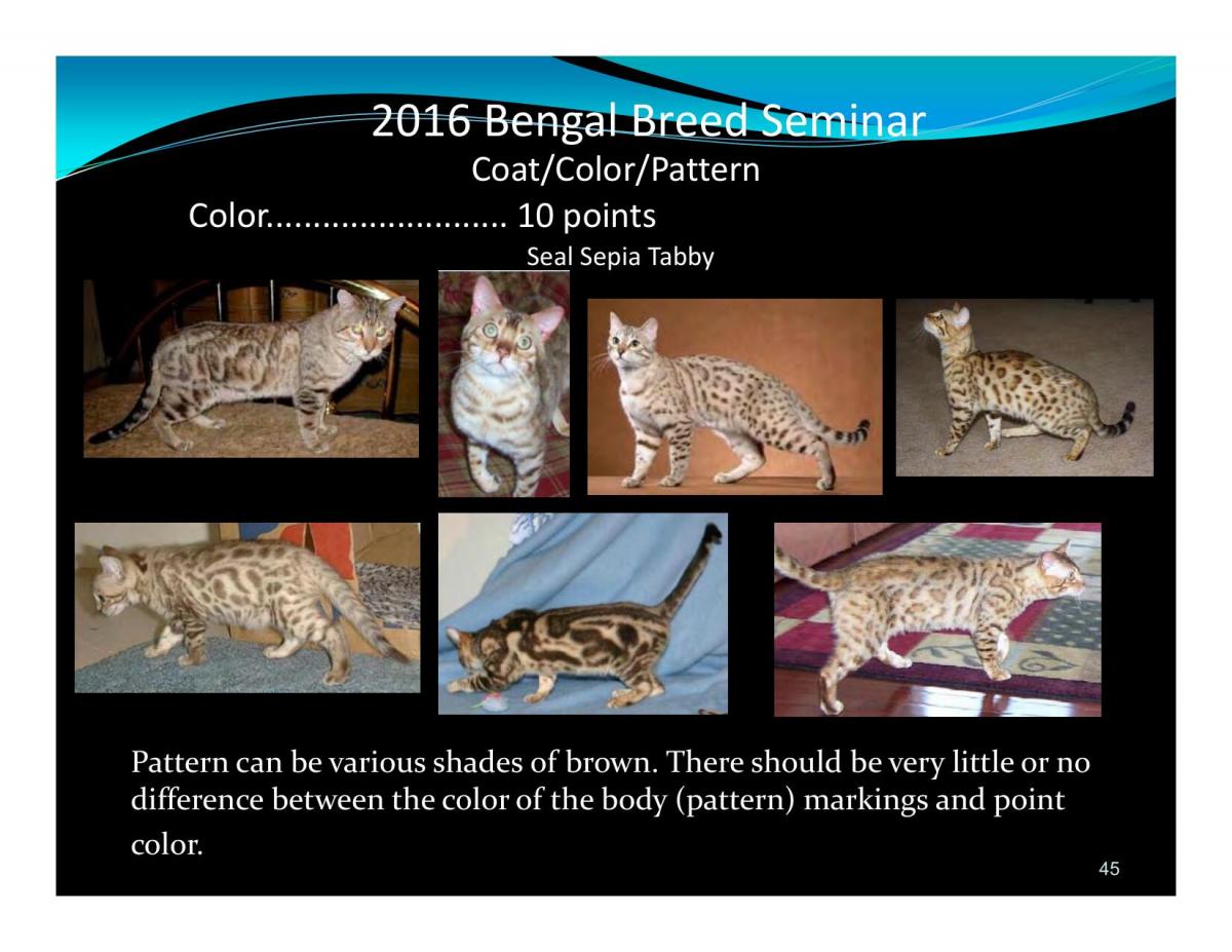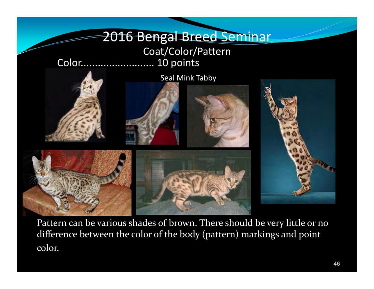 Pattern can be various shades of brown. There should be very little or no difference between the color of the body (pattern) markings and point color.