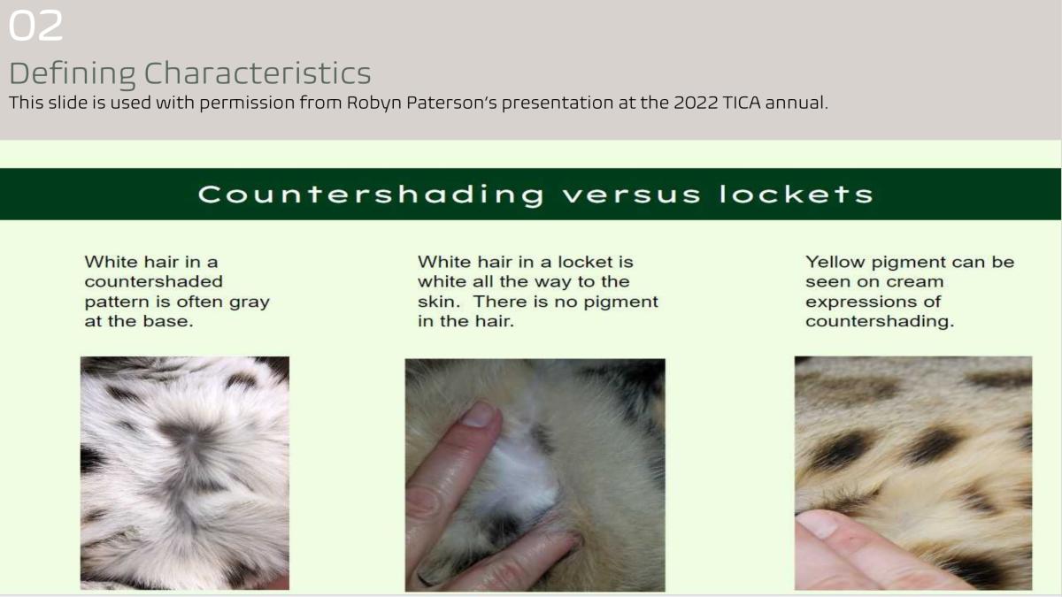 • Clarity of coat is desirable. A moderate or high degree of ticking in the individual hairs will make the overall pattern seem muddy and indistinct .