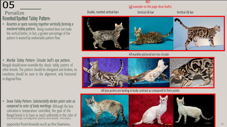 • Marble Tabby Pattern- Circular bull’s eye pattern. Bengals should never resemble the classic tabby pattern of other breeds. The pattern should be elongated and broken, no roundness should be seen in the alignment, only horizontal or diagonal flow.