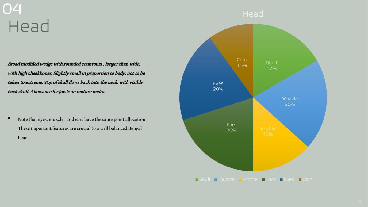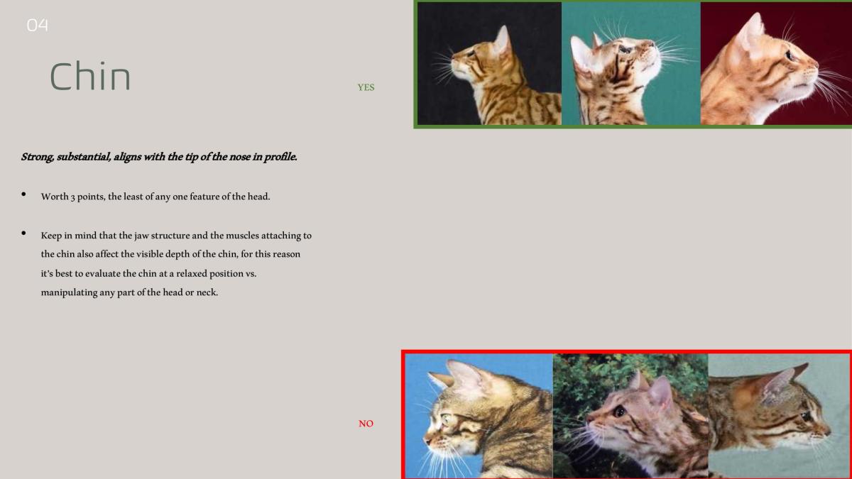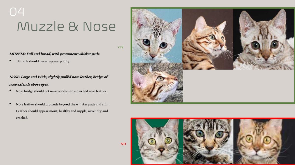 • Note that eyes, muzzle , and ears have the same point allocation . These important features are crucial to a well balanced Bengal head.
