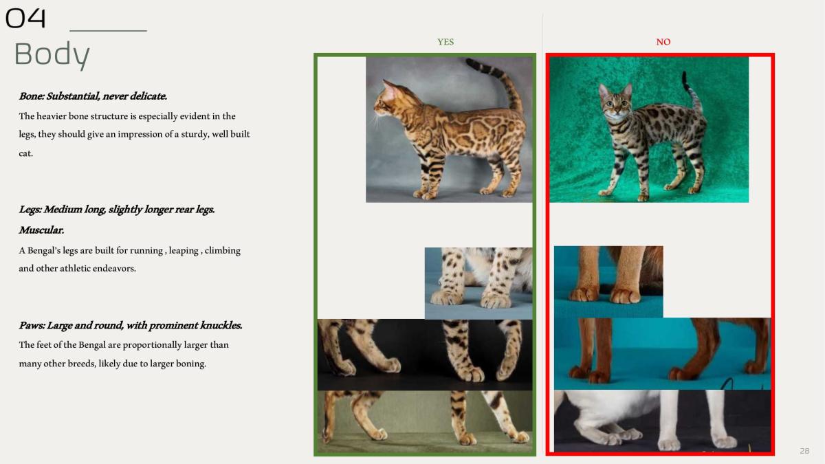• Correct body shape of a Bengal reflects the shape of a small forest dwelling jungle cat.