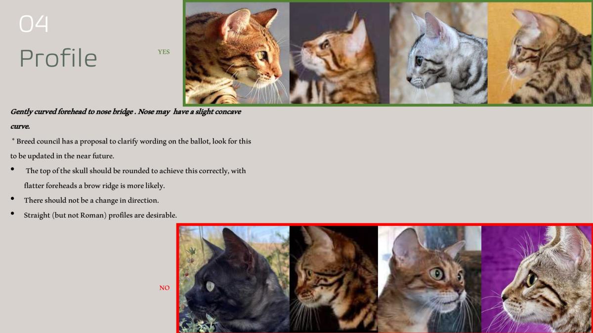 • While the Bengal head is supposed to be longer than it is wide, the majority of the length should be in the forehead and back skull. A longer muzzle will put the eyes too high in the face.