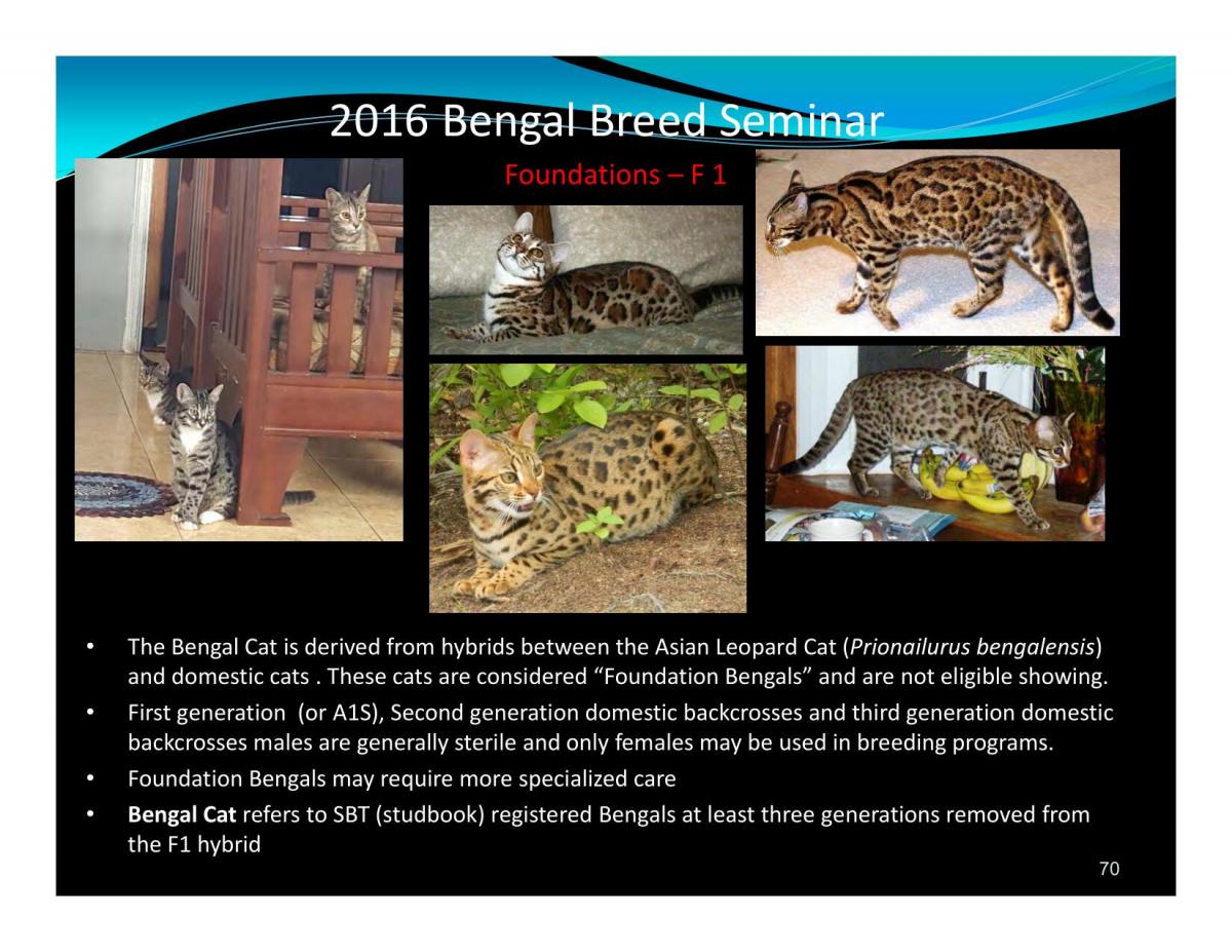 • Bengal Cat refers to SBT (studbook) registered Bengals at least three generations removed from the F1 hybrid