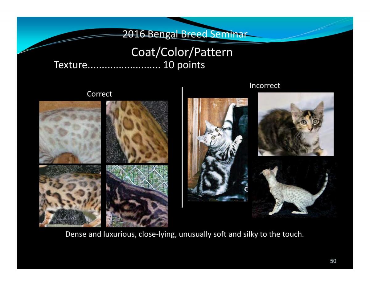 All variations of brown are allowed. Markings various shades of brown to black. Light spectacles encircling the eyes and a virtually white ground color on the whisker pads, chin, chest, belly and inner legs is desirable