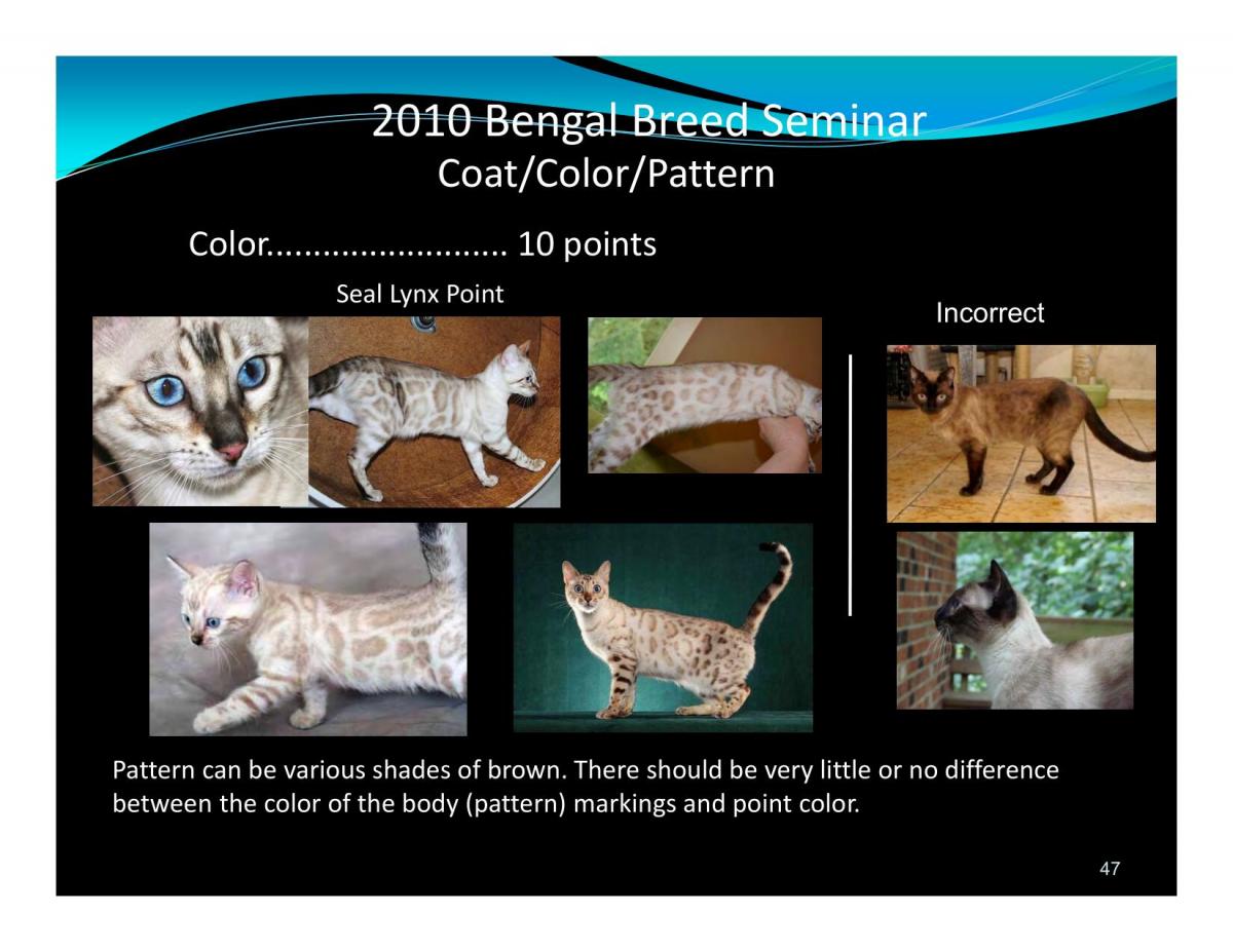 Pattern can be various shades of brown. There should be very little or no difference between the color of the body (pattern) markings and point color.