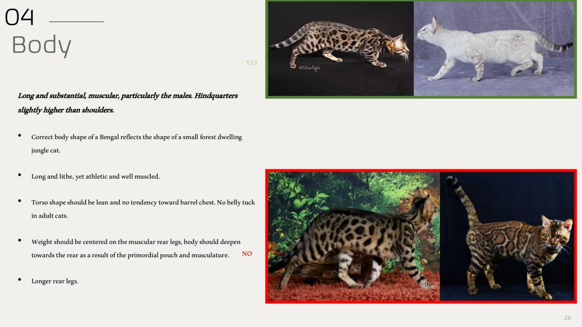 • Correct body shape of a Bengal reflects the shape of a small forest dwelling jungle cat.