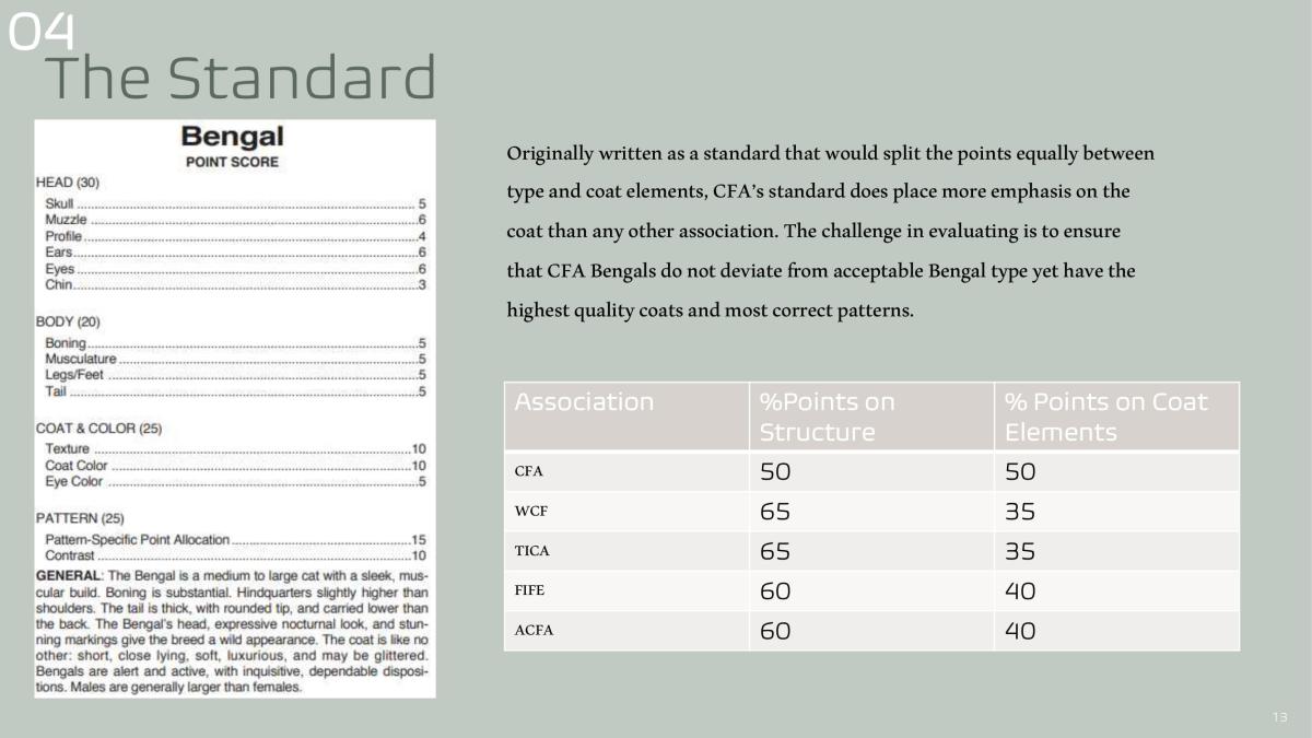 Originally written as a standard that would split the points equally between type and coat elements, CFA’s standard does place more emphasis on the coat than any other association.